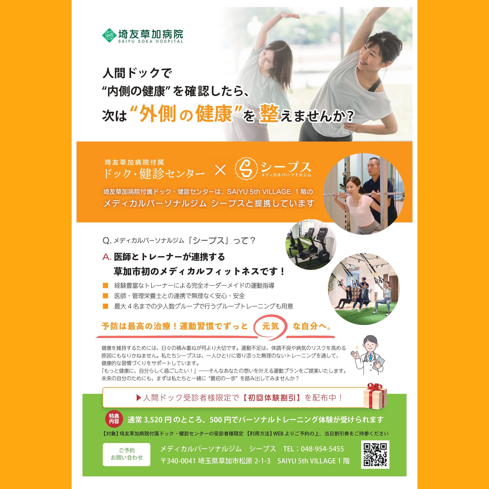 この度、メディカルパーソナルジム シープスは、埼友草加病院付属 ドック・健診センター様と正式に提携していただくこととなりました。